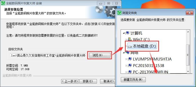 这一步我们需要确定全能数码照片恢复大师的安装路径,安装程序有默认的安装路径:C:Program Files英山县久久发信息科技工作室全能数码照片恢复大师。安装全能数码照片恢复大师至少需要7.9MB磁盘空间。需要修改路径的朋友可以点击浏览按钮,选择需要安装的文件夹后,点击好就可以修改安装路径了。点击安装将全能数码照片恢复大师安装到电脑上;