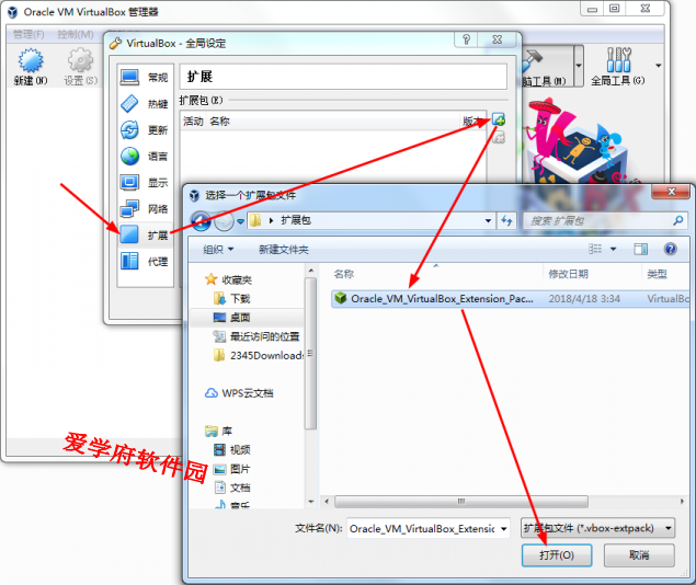 很多可用性更新都是对VirtualBox图形化用户界面的改进,一个大的变化就是支持给单个虚拟主机自定义菜单和工具栏,这样很少或者从不使用的选项就可以彻底删除。另外重要的一点是可以在VirtualBox接口内部对虚拟磁盘进行加密,而不依赖于客户机操作系统自身的磁盘加密功能(假设有的话),爱学府提供的最新版的VirtualBox 5.2版本中添加的VirtualBox客户机功能–更好的视频支持,双向复制和粘贴,以及其它功能–在安装的时候也没有问题,另外由于VirtualBox默认不支持USB设备,所以本次爱学府还贴心集成Oracle VM VirtualBox Extension Pack扩展包,那virtualbox extension pack如何安装呢,其实很简单大家只需参考下图安装到VirtualBox中即可(管理 -- 全局设定 -- 扩展):