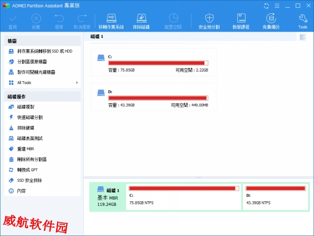AOMEI Partition Assistant(傲梅分区助手)是来自傲梅科技公司的一款功能最强技术员专用的磁盘无损分区工具,实现扩大分区、缩小分区、合并分区、分区恢复、4KB对齐、数据擦除、拆分分区、快速分区、系统迁移以及克隆磁盘等磁盘无损操作,确保数据安全,提供简单、易用的磁盘分区管理操作,傲梅分区助手共有专业版、服务器版、技术员版本和技术员无限版四个版本,繁星软件园测试发现傲梅分区助手是一款不输于DiskGenius的强大磁盘管理工具。