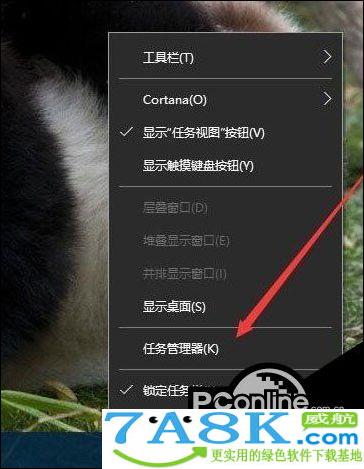 1、右键点击任务栏空白处,在弹出菜单中选择“任务管理器”菜单项;