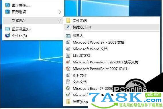 3、通过上面的方法虽然方便一些,但是在重启资源管理器的时候,大家刚才打开的文件就会被关闭。其实我们可以自己建立一个清空剪贴板的快捷方式,在Win10系统桌面空白处,点击右键,在弹出菜单中依次选择“新建/快捷方式”菜单项;