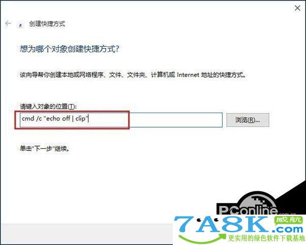 4、接着在弹出的窗口中输入命令行:cdm /c “echo off | clip”,输入完成后,点击下一步按钮;
