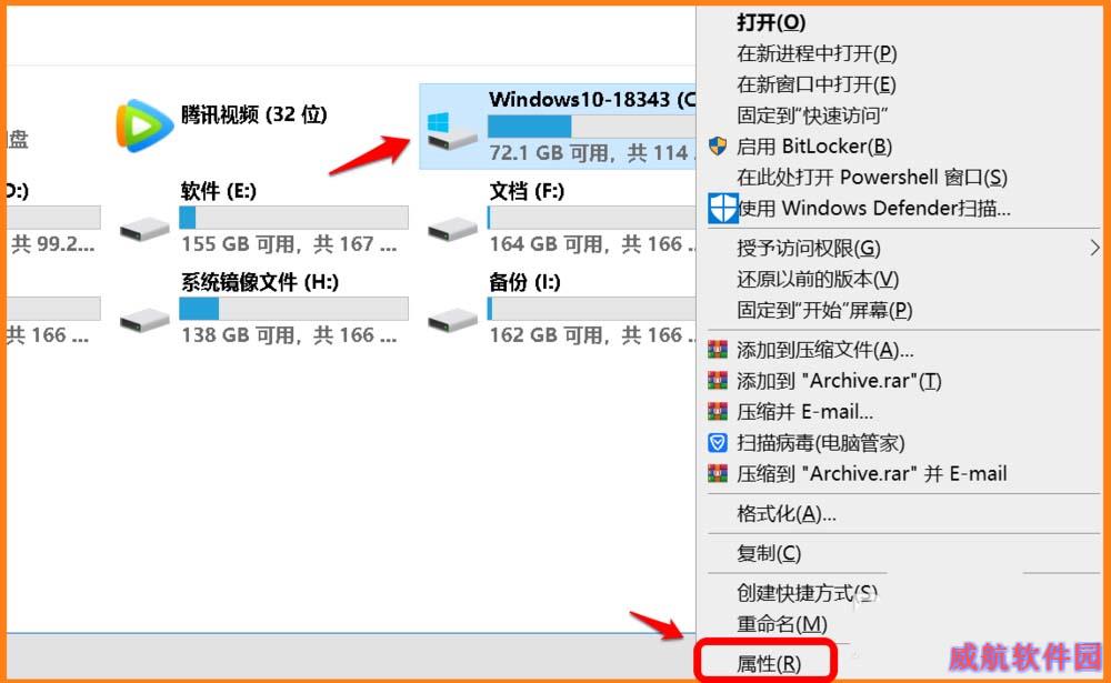 1、进入资源管理器,右键点击SSD硬盘(或任一磁盘) - 属性;