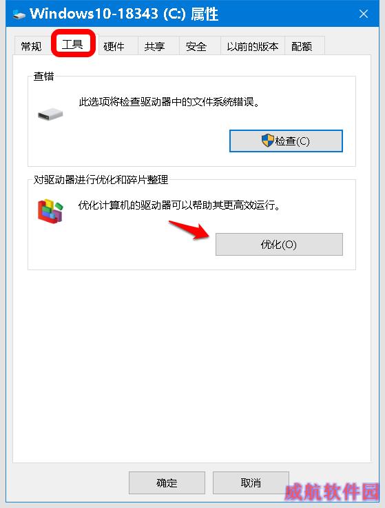 2、在打开的 Windows 10 18343(C:)属性 窗口中,点击【工具】- 【优化】,打开优化驱动器窗口;