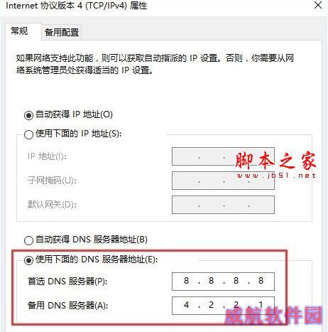4、选择“使用下面的DNS服务器地址”,输入 8.8.8.8 备用 DNS 4.2.2.1 然后点击 确定 -- 确定;如图所示: