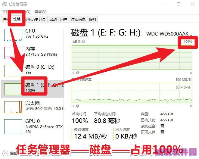打开Win10任务管理器,查看计算机的各个性能指标发现,磁盘无端端的就占用了100%,这当中肯定有鬼!