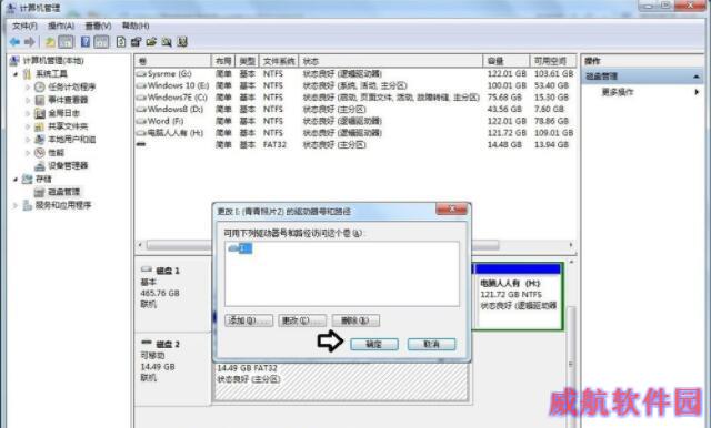 6、打开添加分配一个盘符(倘若曾经已经有盘符,不妨也更换一个)确定;