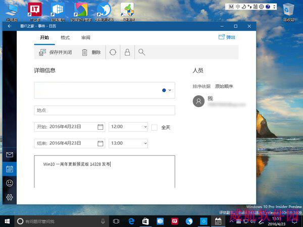 Win10年度更新的任务栏日历已经和《日历》应用相结合,可以在点击任务栏日历后直接设置事件提醒。设置好的内容可以直接显示在日历下的“日程”中。