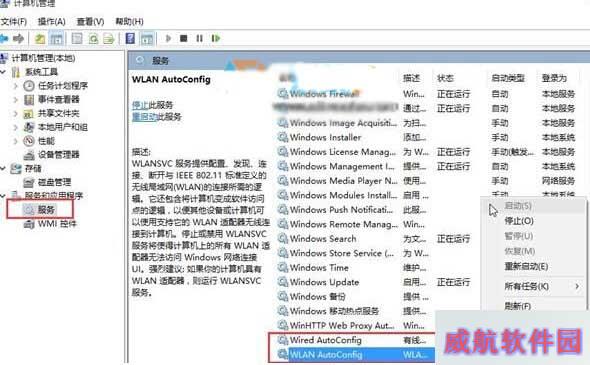 2、打开计算机管理窗口后,单击“服务”,在右侧列表中找到“Wired AutoConfig”与“WLAN Autoconfig”两项服务,查看是否处于正在运行状态。如图所示: