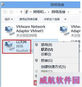 3、随后右键桌面网络图标,选择打开“网络和共享中心”,在弹窗中点击“更改适配器设置”,找到“以太网”图标,右击选择“属性”。如图所示: