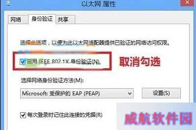 4、最后在以太网属性窗口中,取消勾选“启用IEEE 802.1X身份验证”,点击“确定”保存设置。如图所示: