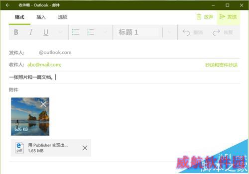 6、现在,填写好收件人和邮件主题,点击窗口右上角的“发送”按钮(一只纸飞机的形状),就可以将一封带有附件的邮件发走了。