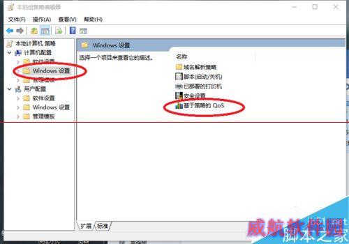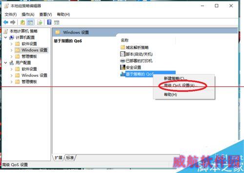 3、在左边找到“windows设置”,左击,然后在右边找到“基于策略的Qos”,右击“基于策略的Qos”,选择“高级Qos设置”,进行如图设置,基本上就没问题了