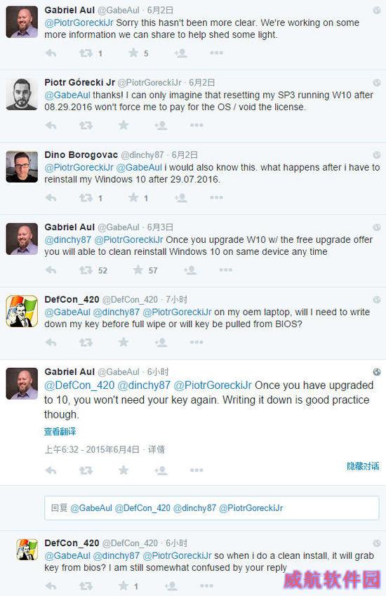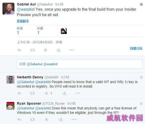 有繁星软件园粉丝问到,他在升级Windows 10预览版时,曾经的Windows 8已经没了,之后是否还有机会升级到正式版。Gabe给出的答复是可以的,一旦从预览版升级到正式版后,一切都搞定了。