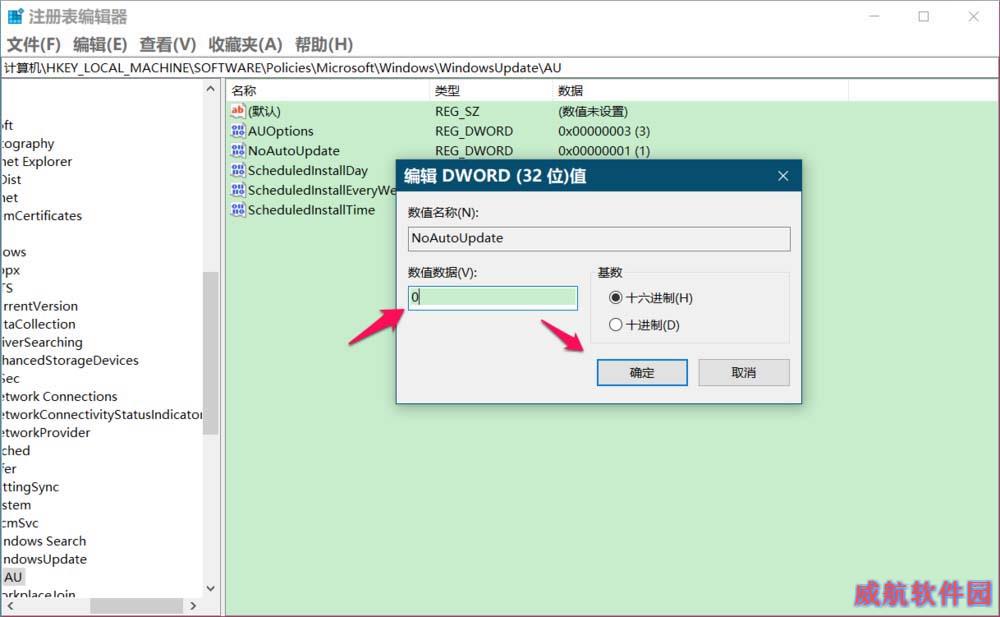 4、我们左键双击 NoAutoUpdate,在弹出的 编辑DWORD(32位)值 对话框中将其数值数据从 1 更改为 0 ,再点击确定;