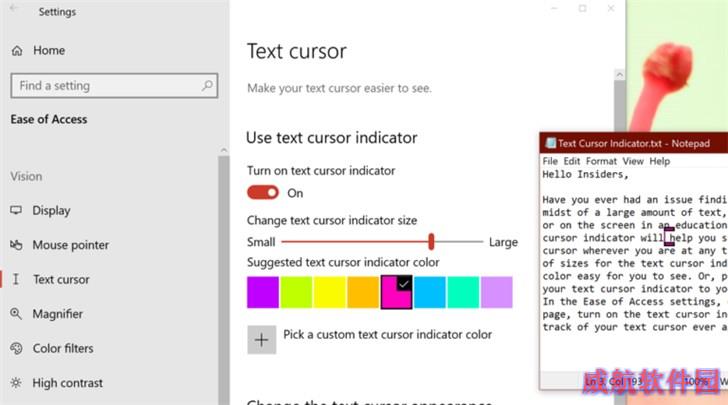 大家是否遇到过有大量文本,演示期间或教育环境中的屏幕上查找文本光标的问题?新的文本光标指示器将帮助大家随时随地查看和查找文本光标。从文本光标指示器的一系列尺寸中进行选择,使其变为易于查看的颜色。或者,根据个人喜好个性化文本光标指示器的颜色。在轻松访问设置中,打开新的文本光标页面,打开文本光标指示器,永远不会再丢失文本光标。