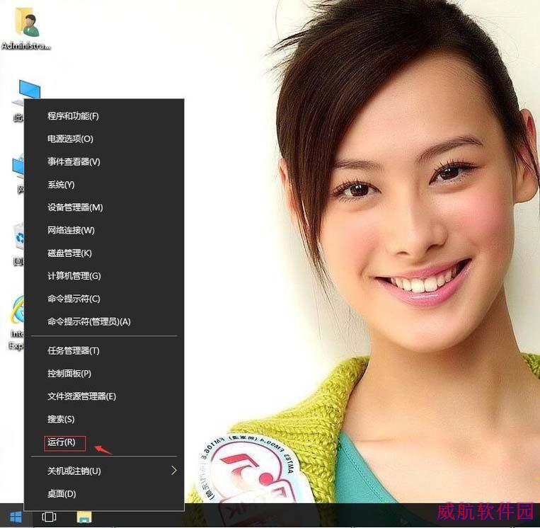 1、在win10系统桌面上,开始菜单。右键,运行。