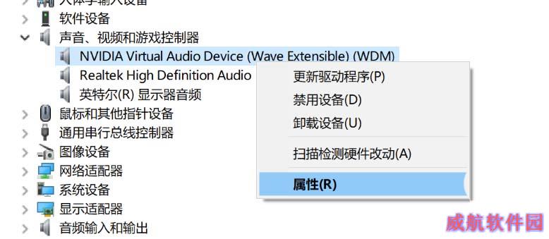 4、点击展开【声音、视频和游戏控制器】,然后右击具体的音视频设备,然后选择【属性】