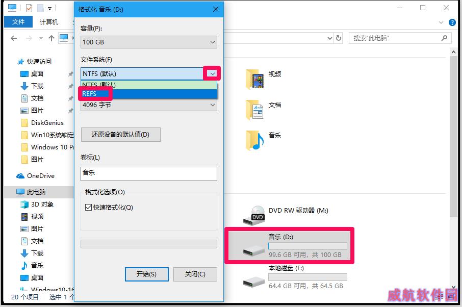 9、进入资源管理器,右键点击:磁盘D:\\ - 格式化,在格式化 音乐(D:)对话框中,点击文件系统的小勾,在下拉菜单中可以看到:ReFS(在原16257版系统中无此项);