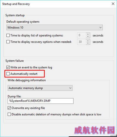 5.现在,在系统故障下,取消选中自动重新启动的复选框。