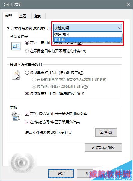 Win10为了方便用户查找常用文件,把“快速启动”作为资源管理器打开后的默认首页。但有些Win7/Win8.1老用户不太习惯这种操作方式,而且这也可能泄露自己的隐私。所以可以把默认首页恢复到原有的状态,即显示系统磁盘分区等内容。用户只需在文件夹选项→常规→打开文件资源管理器时打开中选择“此电脑”,就可以恢复曾经的状态。