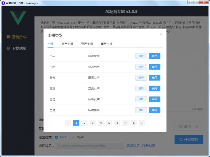 AI配音专家是一款完全免费开源且相当实用的文字转语音真人发声工具,就是大家经常用到的能把文字读出来的软件,采用阿里语音合成引擎,内含男生主播、女生主播以及童声主播三种主播类型共计45个主播,文字转语音效果那是非常的理想,语言种类也一应俱全,AI配音专家还支持背景音乐播放,便于在文字转语音的过程中加入合适的背景音乐,做出来的音频会更加的完美,倘若大家需要一款靠谱且支持真人发音的文字转语音软件的话,繁星软件园建议大家试试AI配音专家吧。(百度云盘分享密码:7a8k)