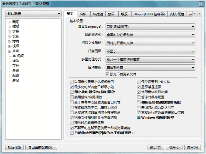第二步:为了确保potplayer播放器的彻底无边框,大家还需要进一步设置,再次运行potplayer播放器,按“F5”快捷键进入设置界面,点开“基本”,选择“启动”按照图示设置数据。然后点击“播放”选择“无边框尺寸”模式,好了亲们开始享受吧: