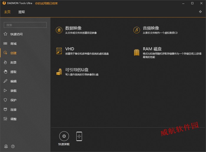 最强映像工具和虚拟光驱软件:装载所有类型的映象,含虚拟硬盘和更多从光盘、文件和音频曲目创建虚拟映像模拟无限量的DT,SCSI,IDE和HDD虚拟设备编辑、转换、压缩、分割、保护和刻录映像。