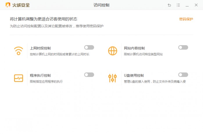 访问控制:火绒安全软件支持用户自定义电脑的使用权限,让您充分控制自己的电脑不被他人随意使用,控制上网时间长与时间段,限制访问指定网站,限制指定程序运行,管理U盘的接入权限。