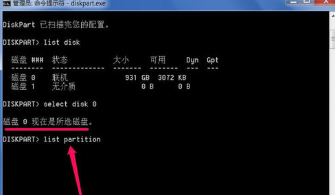 6、进入第一个磁盘后,即disk 0,在电脑中,一般把第一个磁盘设置为0,再输入 list partition 命令,意思是列出磁盘0的所有分区磁盘;