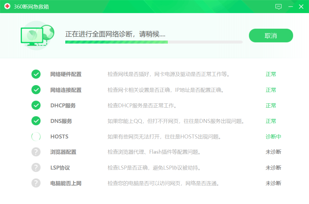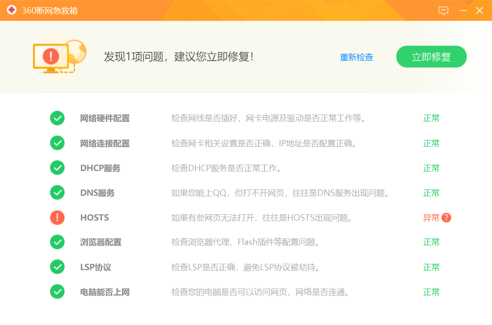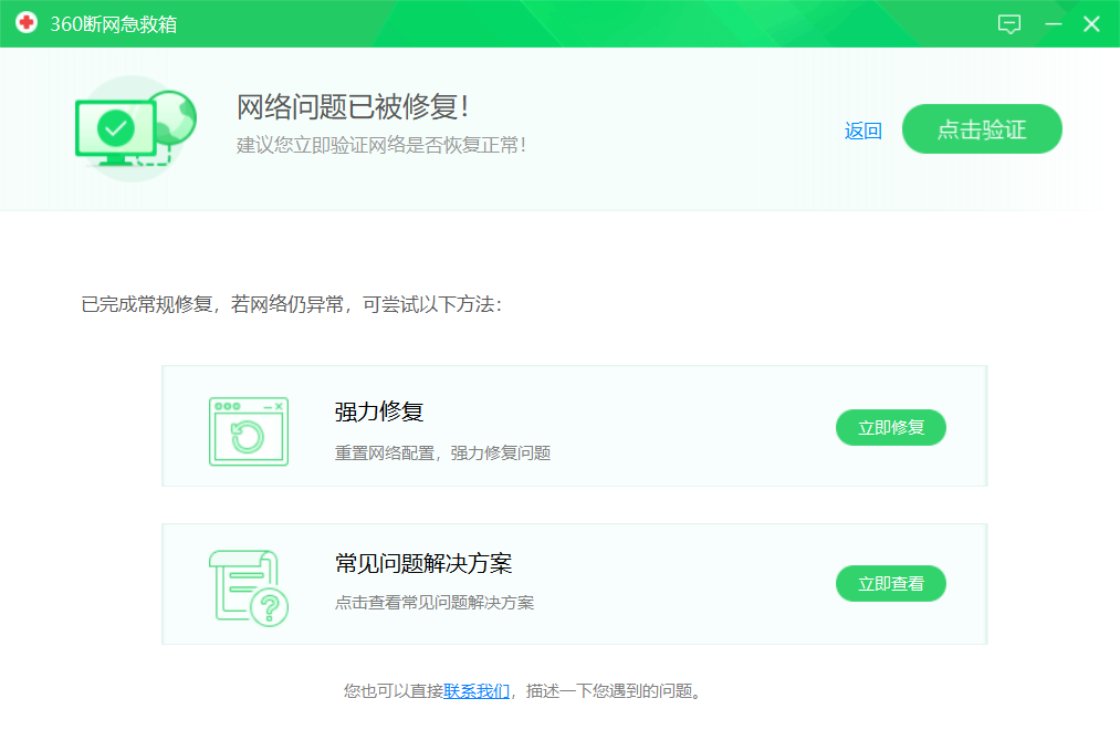 360断网急救箱依托360安全大脑,对网络相关的软硬件配置,系统服务,网络协议,代理服务器设置,浏览器配置信息等相关项目进行一键全面检测,基于检测结果,智能一键修复,恢复系统默认配置;针对疑难网络故障,提供“强力修复”,360断网急救箱智能自动化为大家解决各类网络故障,网页无法打开、网络连接红叉等常见网络故障。