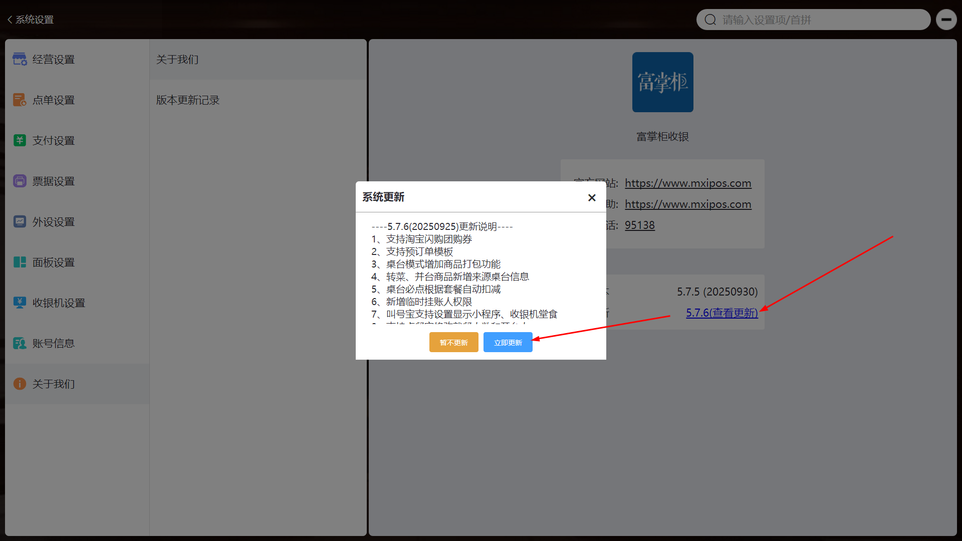 方案1(推荐):升级富掌柜版本到最新版,可以自动完成问题修复,依次点击右上角:设置----关于我们----查看更新---立即更新: