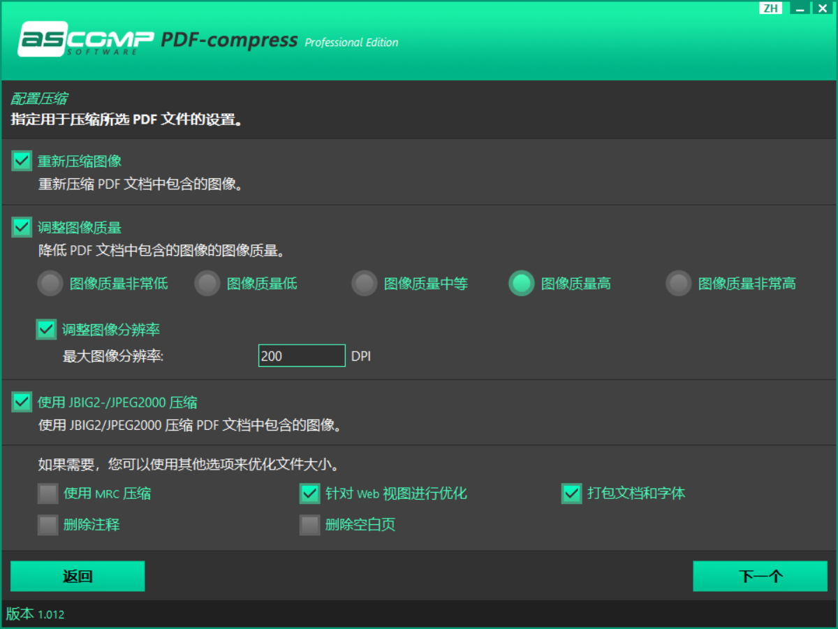 - 应用 MRC 优化技术、JBIG2/JPEG2000 压缩算法,还能移除空白页、注释及不必要内容。