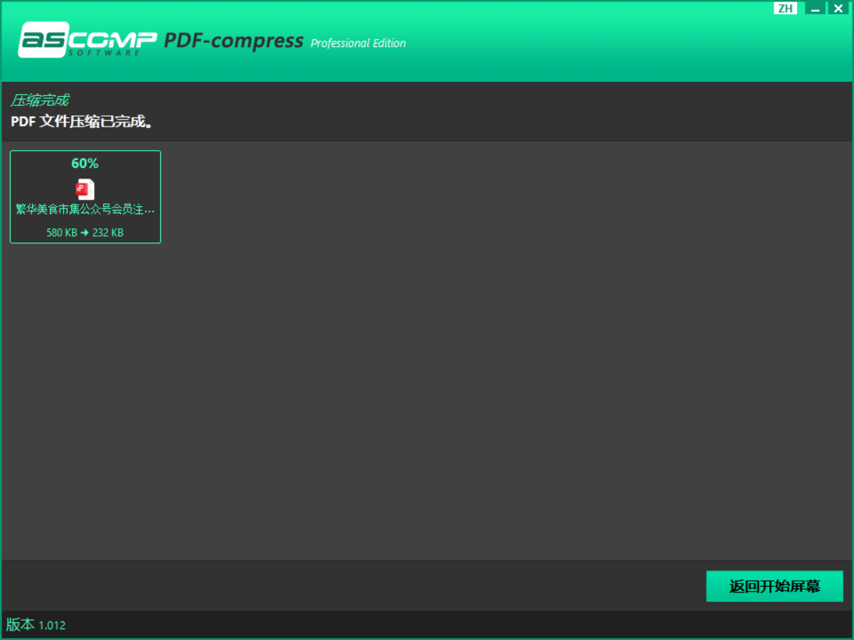 - 执行压缩,可查看实时进度,完成后显示具体压缩率。