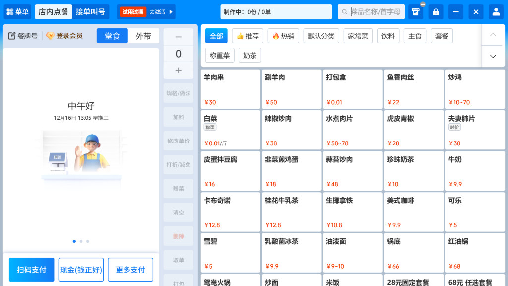 - 点单操作(收银机端):支持挂单 / 取单、离线订单创建、快速买单、临时菜添加;称重菜可去皮,可关闭称重菜确认弹窗;点单页可显示菜品图片。