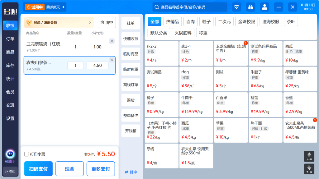 灵活商品管理:完美支持标准品、称重商品、计数商品、组合商品。