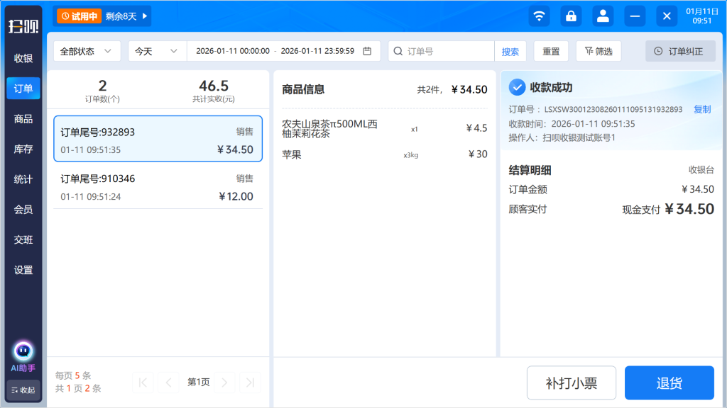 订单管理:所有订单(销售单、退货单)清晰可查,支持筛选、检索、补打小票。