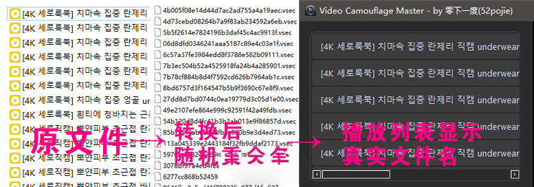 Video Camouflage Master将普通的视频或图片加密为 .vsec 格式并随机命名。每个人生成的vsec是独一无二的,即使别人下载了同样的视频伪装软件,也无法播放你加密后的视频。