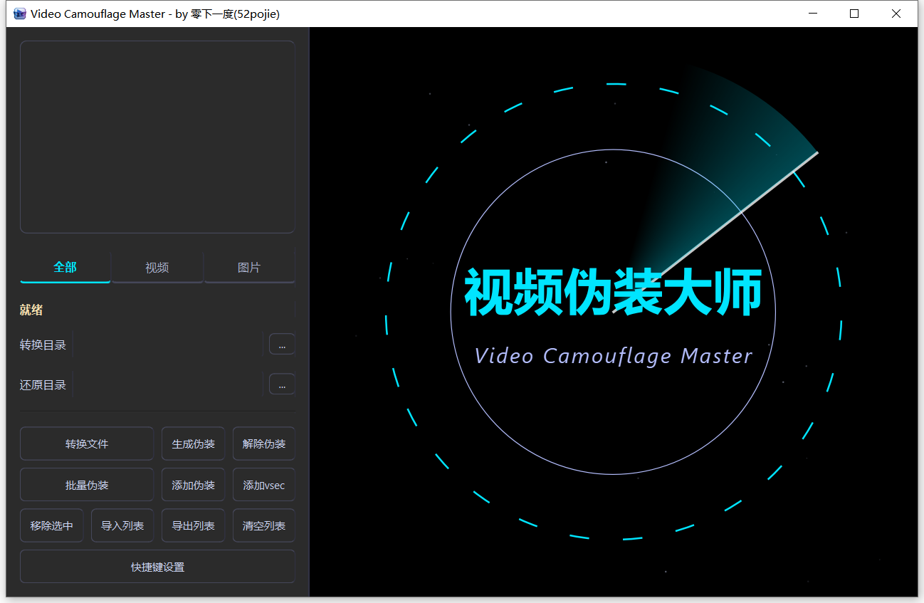 Video Camouflage Master 是一款专注于个人视频隐私保护的特殊桌面多媒体工具,就是大家常说的视频伪装软件,它不仅能够对用户的私密视频和图片进行高强度加密,还具备独特的“文件伪装”技术。用户可以将加密后的私密文件隐藏在普通的视频或图片中(称为“伪装”),Video Camouflage Master生成的文件在外人看来只是一张普通的图片或视频,但在这款视频伪装软件中,大家可以轻松还原并播放其中的私密内容,想知道视频伪装软件哪个好用吗,字节律动为大家推荐并提供最新版本的视频伪装软件下载。