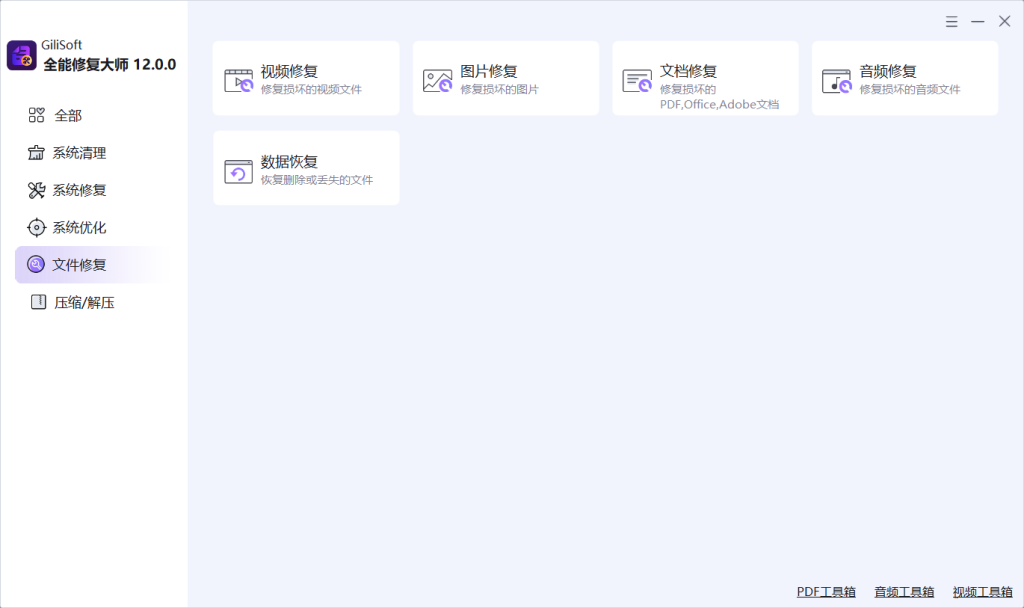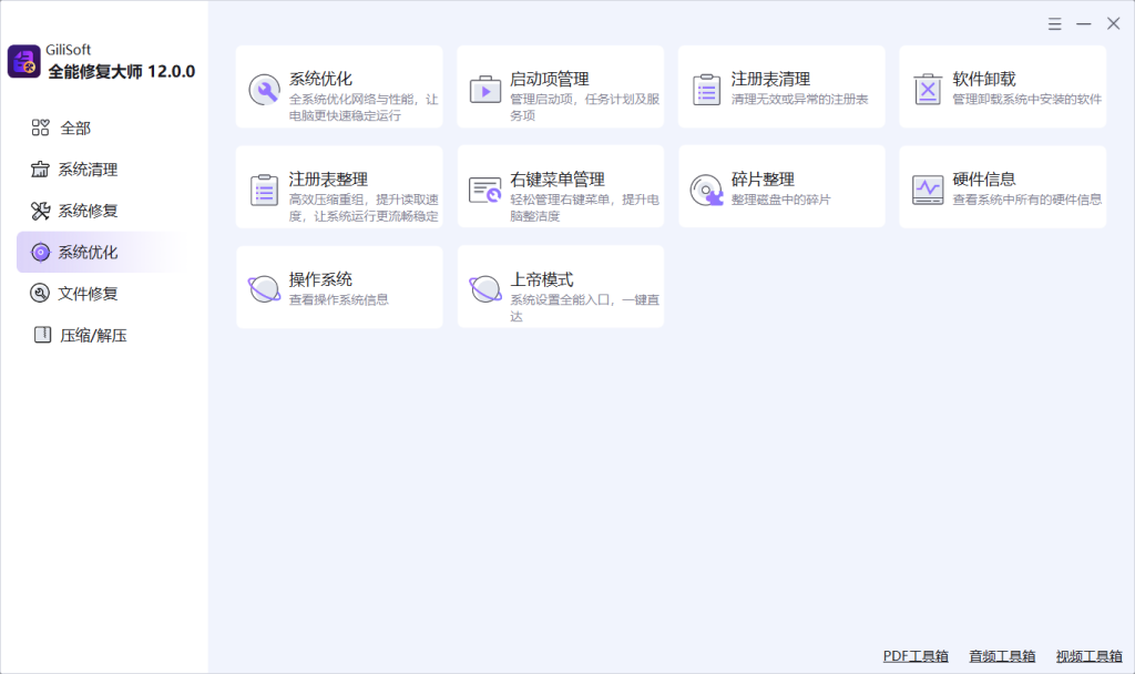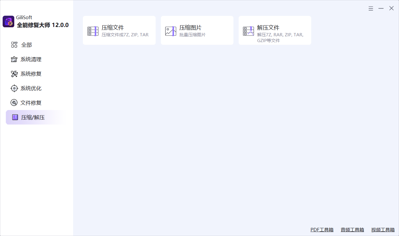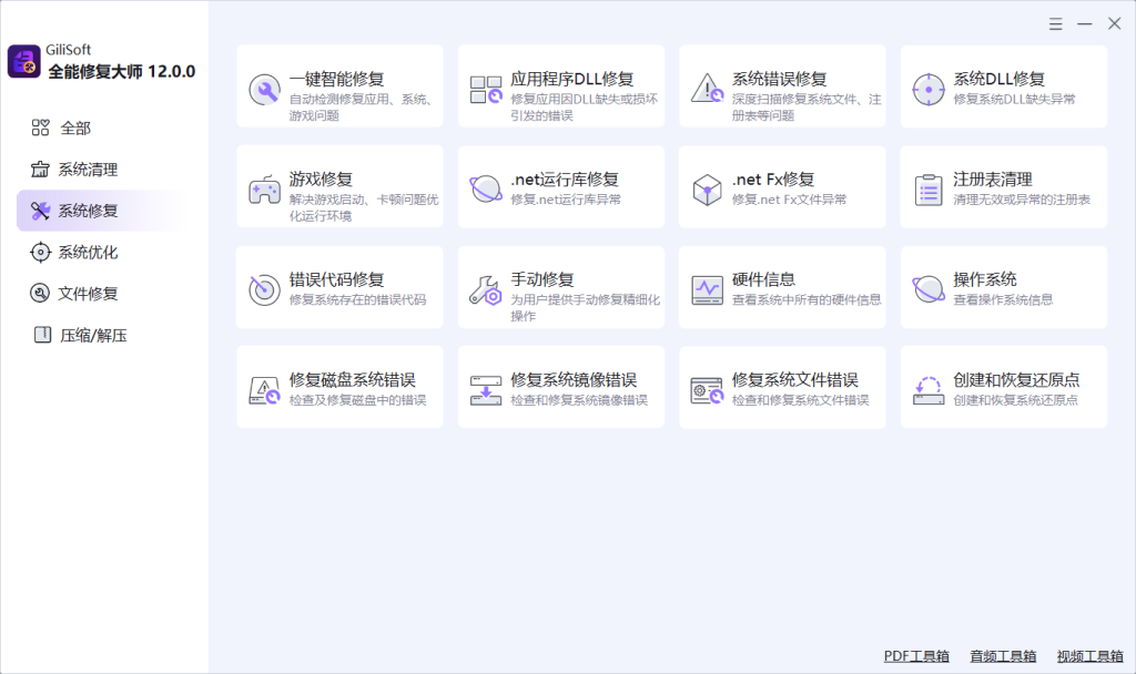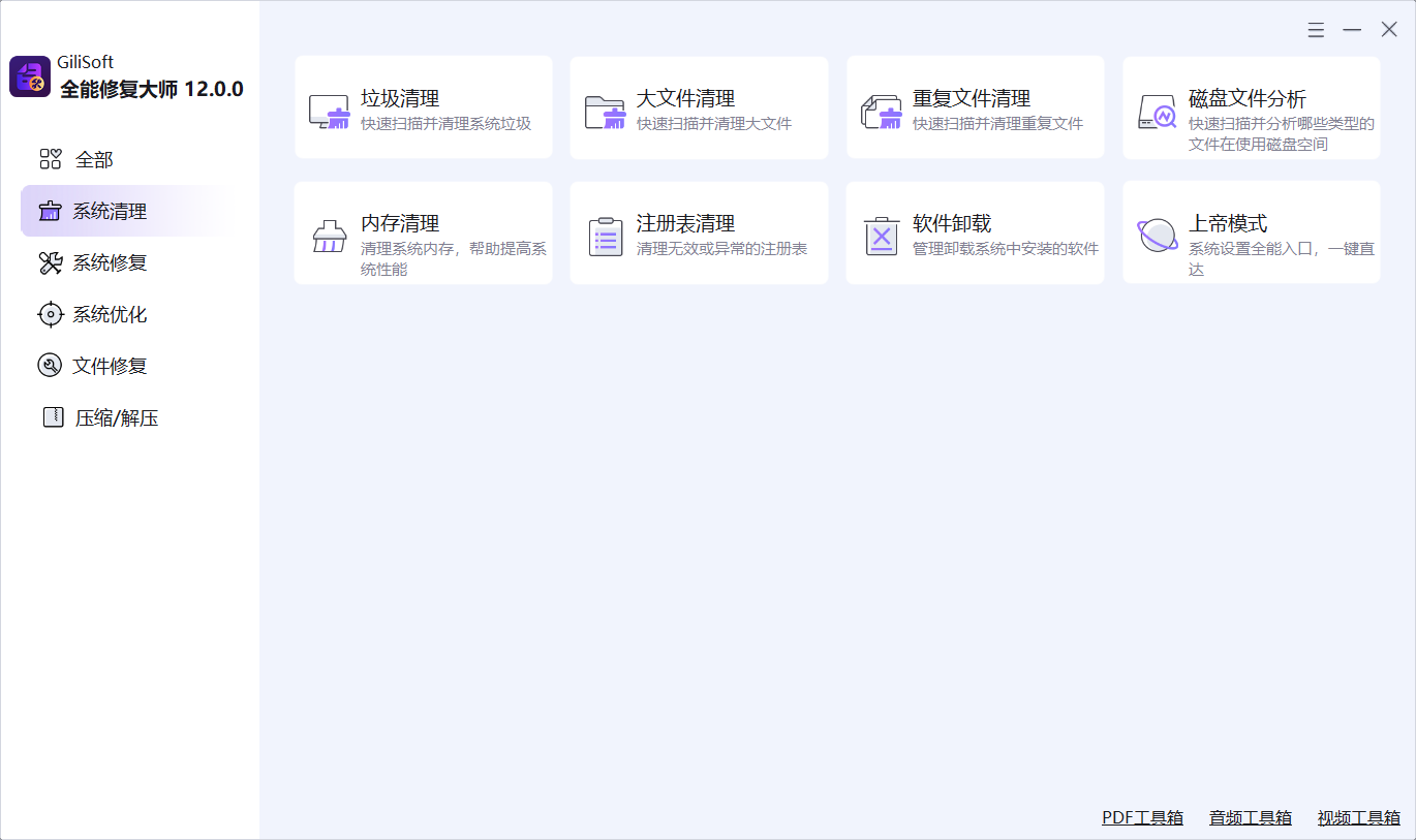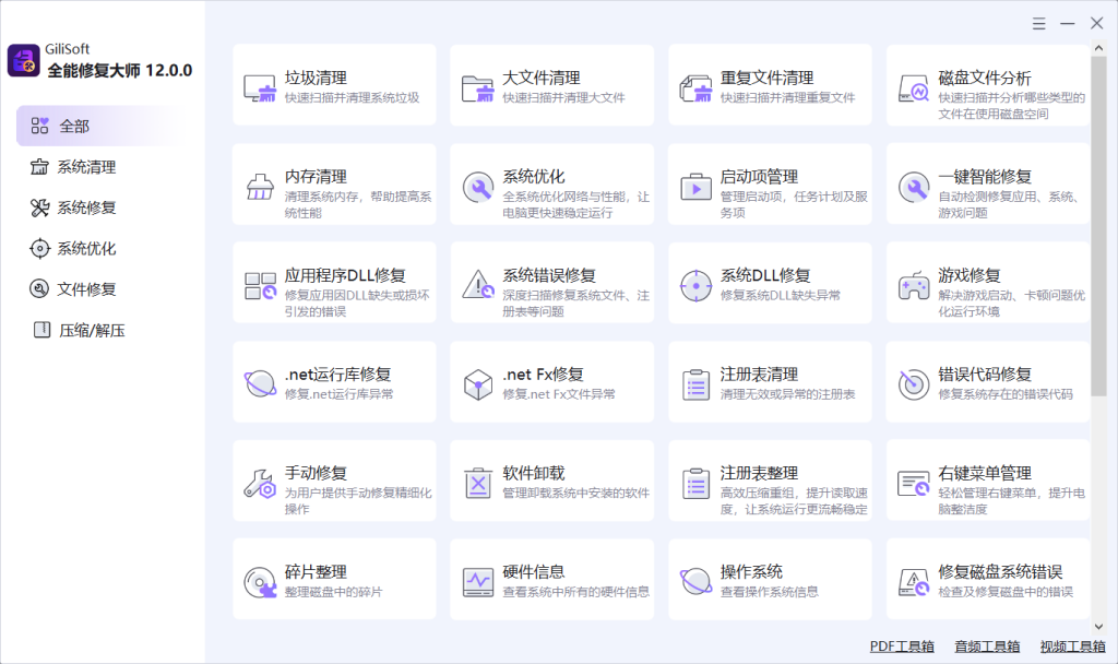 GiliSoft Total Repair 是一款面向 Windows 用户的一体化系统维护工具箱,围绕 System Clean(系统清理)、System Repair(系统修复)、PC Optimization(PC 优化) 和 Compression(文件压缩) 四大实用工作流构建。它将垃圾清理、注册表清理、DLL 修复、启动项管理、磁盘分析、软件卸载以及文件压缩解压等功能整合到一个桌面应用中,用户无需在多个独立工具之间频繁切换,即可一站式完成日常 PC 维护、Windows 故障排查和系统优化工作。